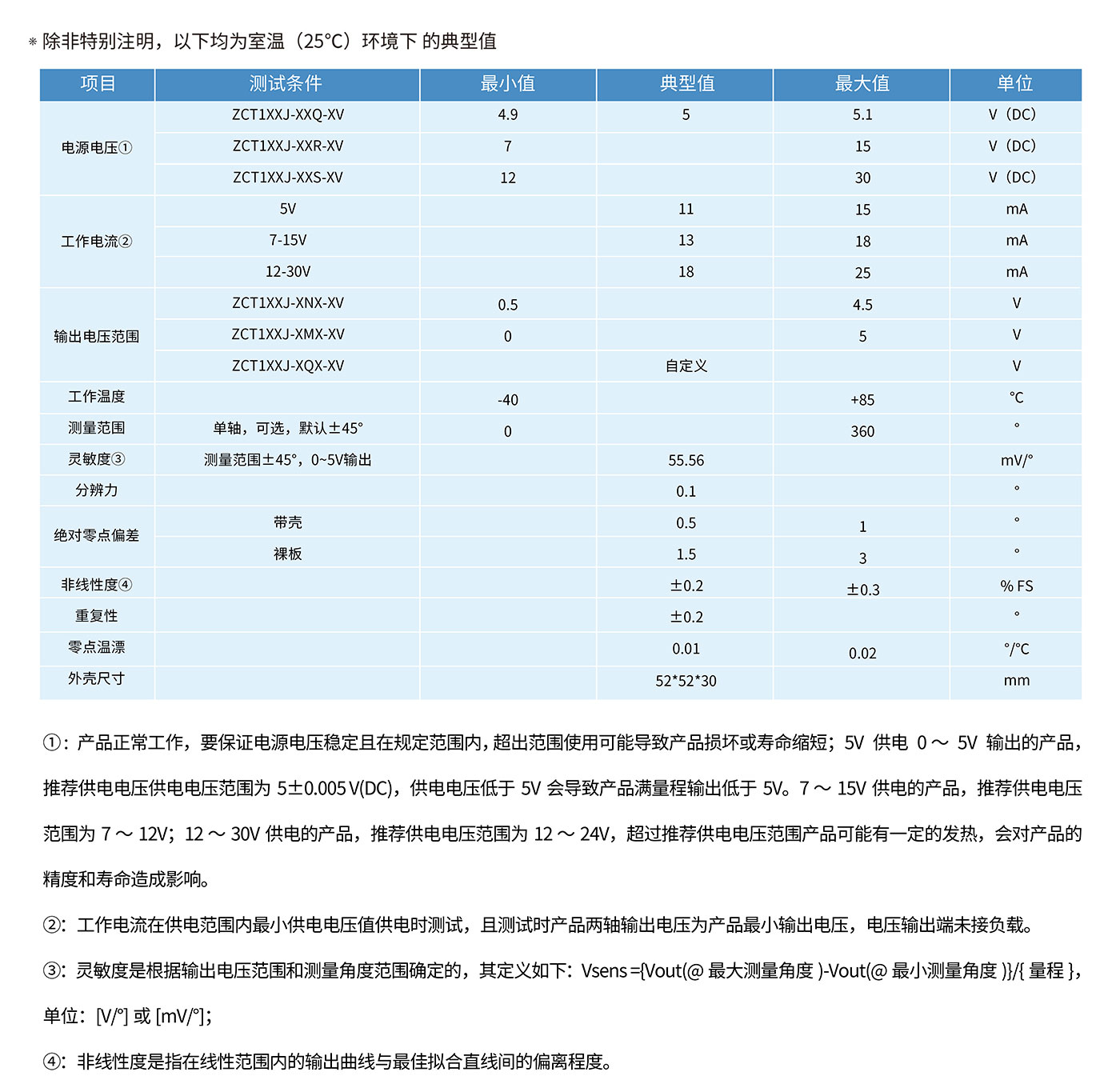 ? ? ? ? ? ? ?ZCT1XXJ-XXX-XV 是直川科技研發(fā)生產(chǎn)的單軸模擬電壓傾角傳感器 ,0.5 ~ 4.5V 或者 0 ~ 5V 電壓輸出。